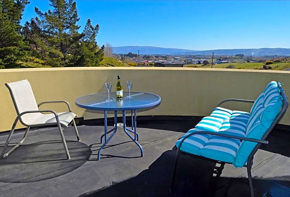 This large room has a private balcony with stunning views to the garden and across the Taieri plains towards the mountains. It has a queen bed with quality European linen, a sofa and a small kitchenette with a microwave, toaster, a refrigerator and tea/coffee making facilities. It also includes a walk-in wardrobe, which leads to the 2nd bedroom, which has 1 double bed and a shower room with complimentary toiletries. A TV with free satellite channels and free WiFi are provided.